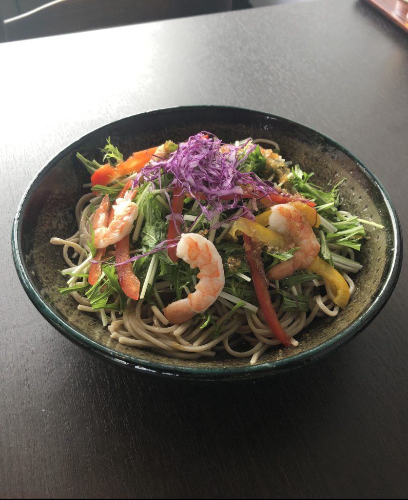 6月21日(火)より期間限定の新商品「サラダ蕎麦」(930円)を販売致しました。こちらはつむぎ自家製ドレッシングを蕎麦にからめ、水菜・パプリカ・紫キャベツ・蒸しエビをのせた具材たっぷりの蕎麦です! この夏にはぴったりの一