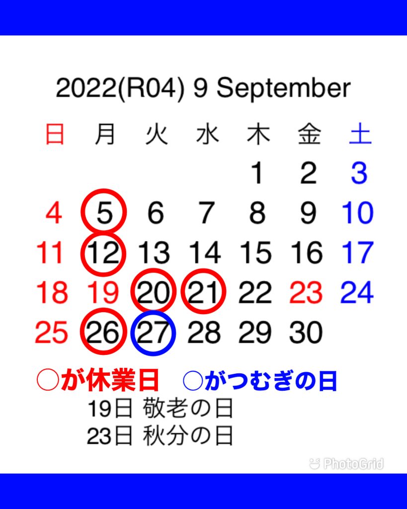 いつもそば処つむぎをご愛顧いただきありがとうございます😊 9月の予定表を添付致します。 19日の㊗️日は営業致します。 20日、21日は振替として お休み頂きますので、 よろしくお願い致します🙇♂️ 26日はつむ(26