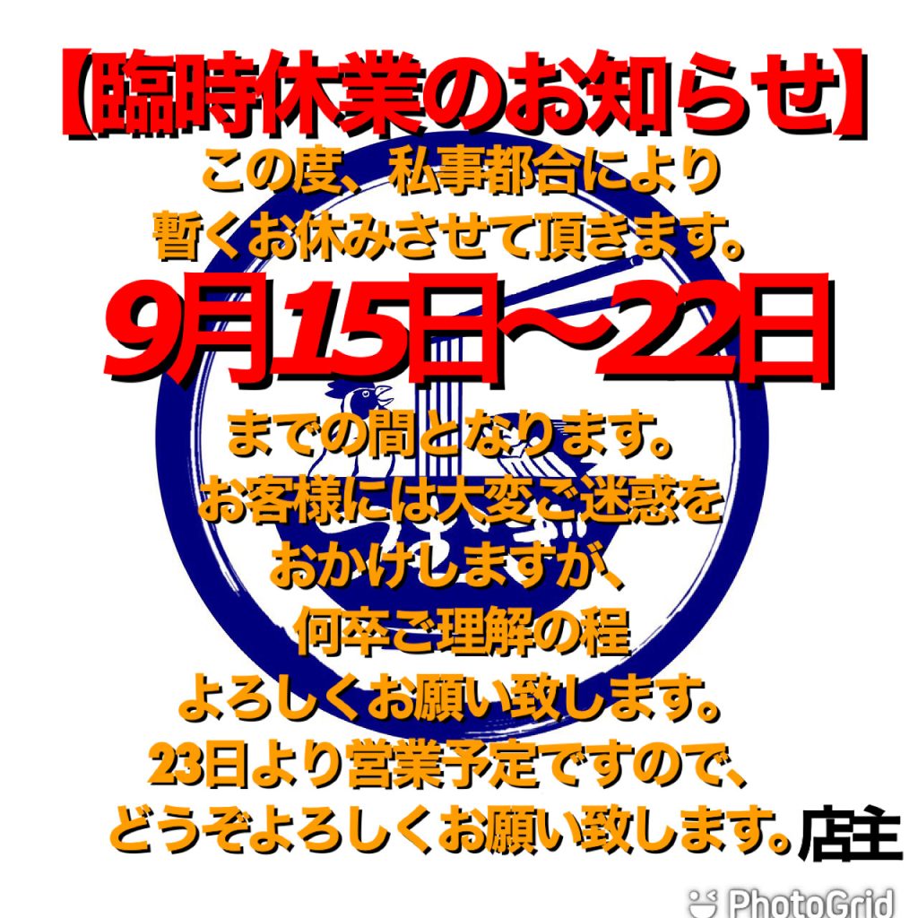 この度、急遽、私事都合により 暫くお休みさせて頂きます。 本日9月15日〜22日までのお休みとなります。 日頃、当店のご利用を楽しみにして下さっているお客様には大変申し訳ございません。 お客様にはご迷惑をおかけしますが、 […]
