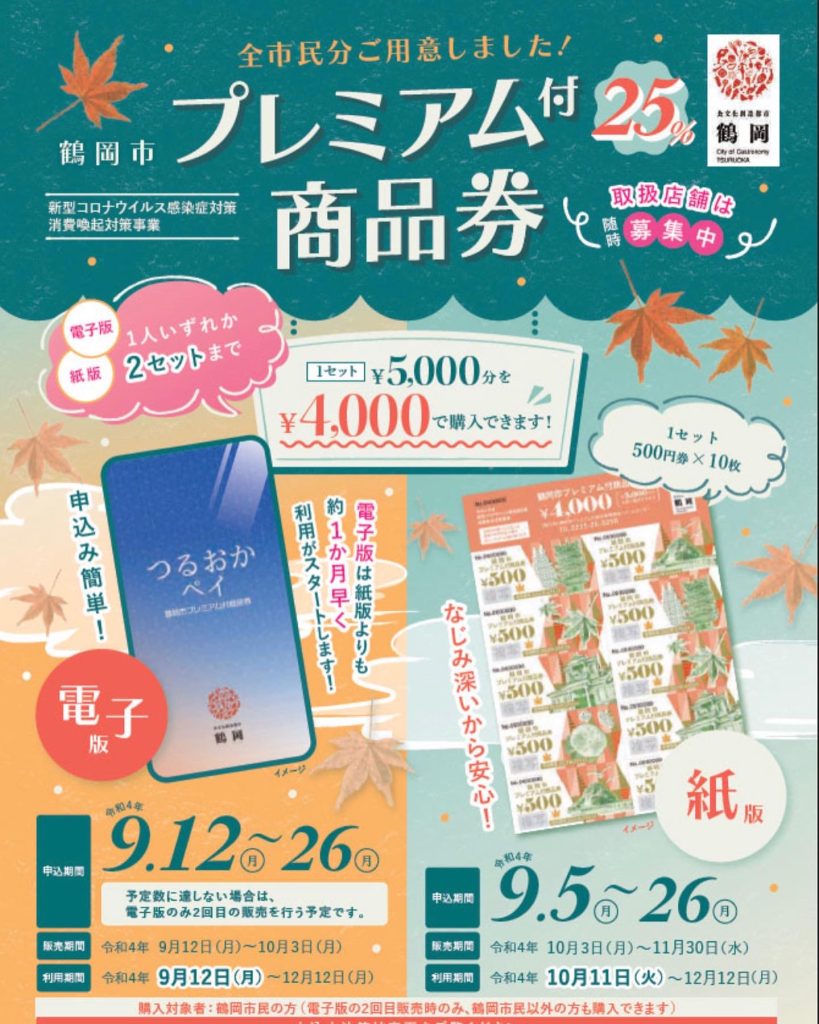 そば処つむぎは鶴岡プレミアム商品券対象店舗です! 本日より鶴岡プレミアム商品券の電子版の利用が開始されました。 当店は本日お休みでしたので、明日からご利用頂けます! 4,000円の購入で5,000円分ご利用頂ける大変お得